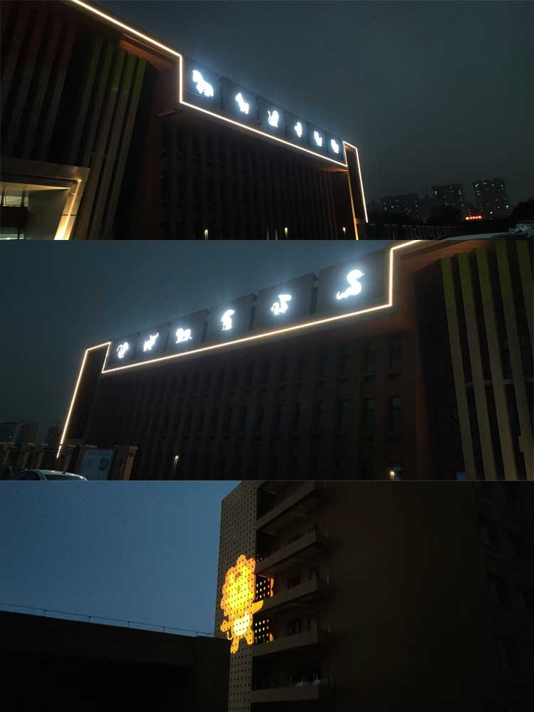 西安市兒童福利院亮化工程,主要是采用線條燈對樓體的頂部和側面輪廓進行勾勒,主樓安裝十二生肖發(fā)光造型,側墻采用圖案燈進行動畫投影,打出絢麗多彩的動畫卡通人物,與建筑的實用完整結合。