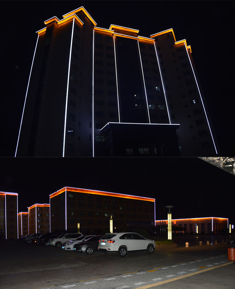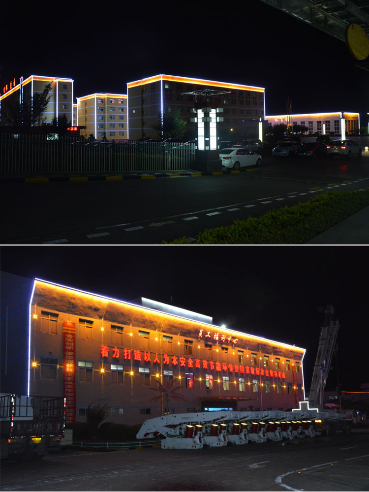 簡介—— 銅川建新煤化是我公司承接的廠區亮化工程之一,該項目整體從設計到施工,全程有我公司承擔負責,設計根據甲方的要求,采用簡潔明了的線條勾勒輪廓和打亮為主。在廠區主要的辦公樓、餐廳、員工活動中心、員工福利中心、員工宿舍樓等員工主要活動的場所樓進行重點亮化。